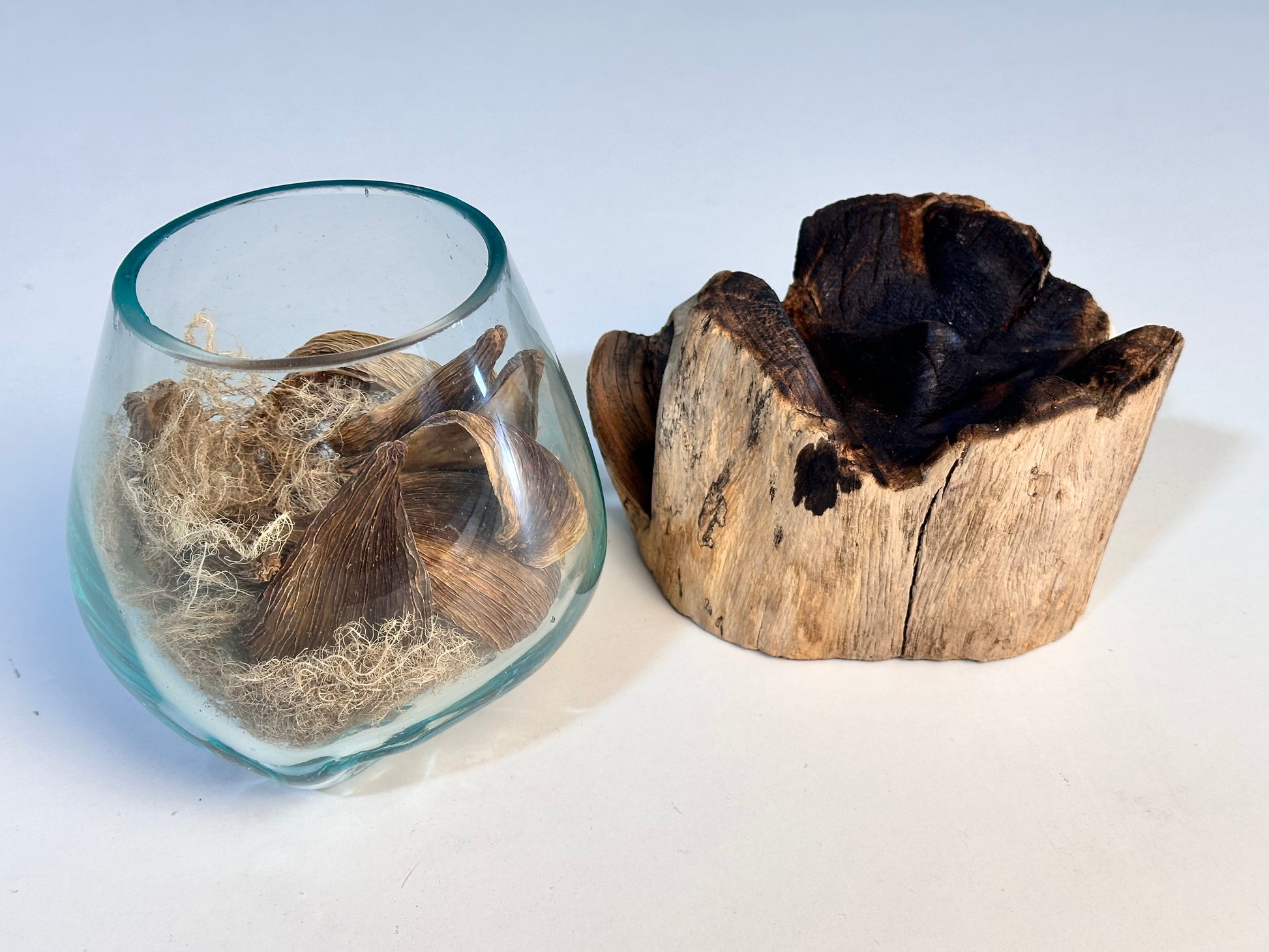 Exquisitely unusual and beautifully formed, this glass bowl is formed onto the driftwood base whilst still Molton glass, then shaped as it hardens to produce a unique and individual display bowl.