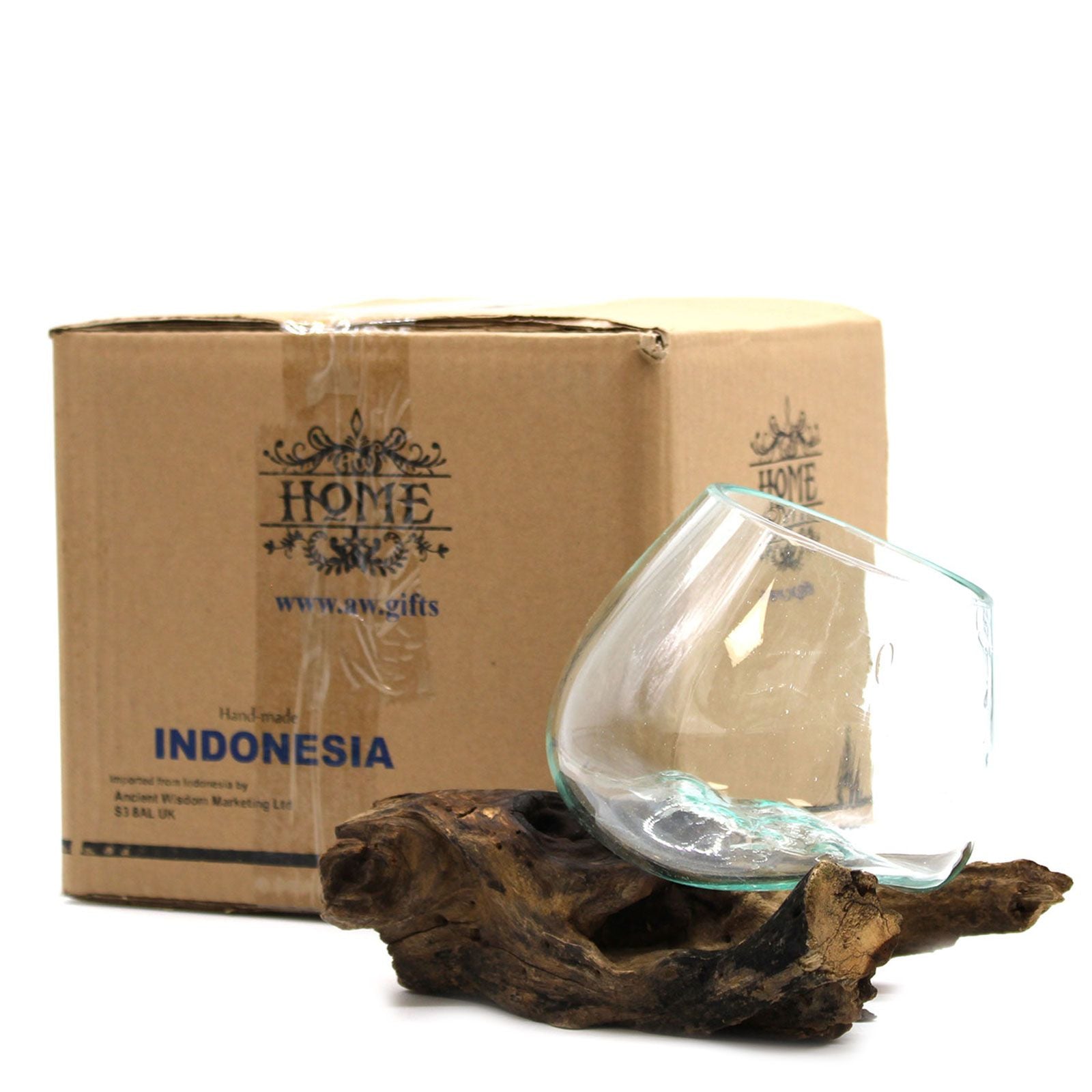 The glass is hand-blown and while still hot it is then relaxed over a piece of Gamal root, the glass then hardens to the shape of the wood ensuring a perfect fit. They are crafted using a natural product by using hand tools in the traditional Balinese way. It provides a one-of-a-kind setting for stones and air plants, cut flowers or a wine decanter.