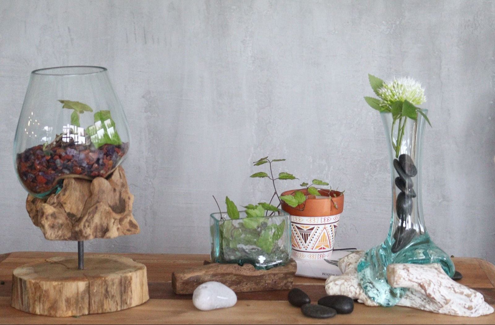 The glass is hand-blown and while still hot it is then relaxed over a piece of Gamal root, the glass then hardens to the shape of the wood ensuring a perfect fit. They are crafted using a natural product by using hand tools in the traditional Balinese way. It provides a one-of-a-kind setting for stones and air plants, cut flowers or a wine decanter.